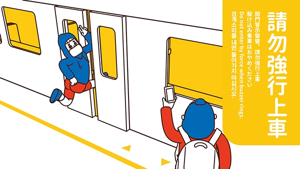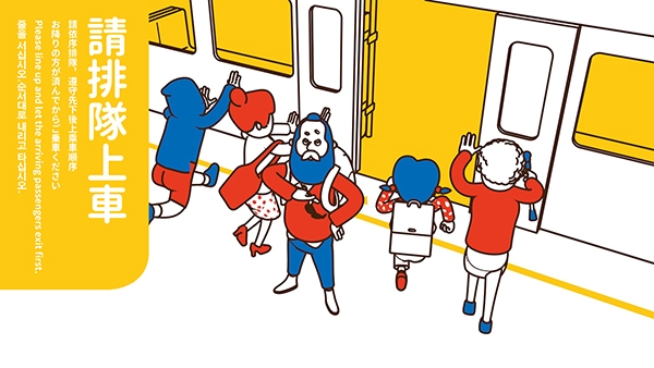 “设计进站”活动将“请勿强行上车”“请排队上车”“请勿饮食”等安全须知用诙谐幽默的插画形式展现,而这种动漫风格营造的反差萌也让台北捷运的形象更亲民。