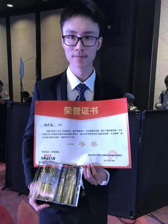 获得中学组个人和集体一等奖两项大奖的杨予辰是湖州德清县高级中学的高三学生,热爱诗词朗诵的他为了能参加决赛,